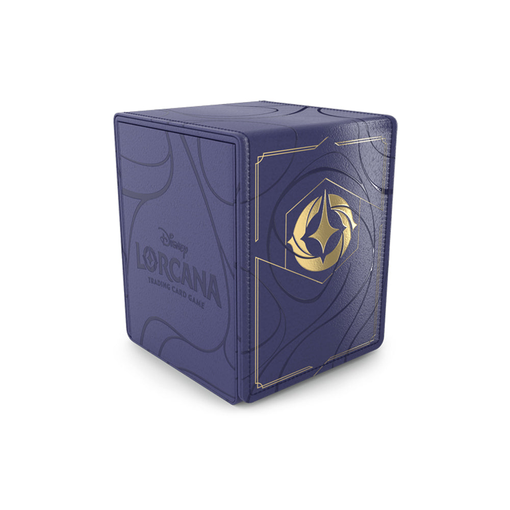 The Premium Deck Box, crafted with foil embellishments, a leatherette finish, and a strong magnetic closure, offers both style and functionality, safeguarding a player’s deck in a most stylish fashion. The fold-out lore tracker, featuring gold accents, is a great way for Illumineers to keep track of their progress as they race to victory.