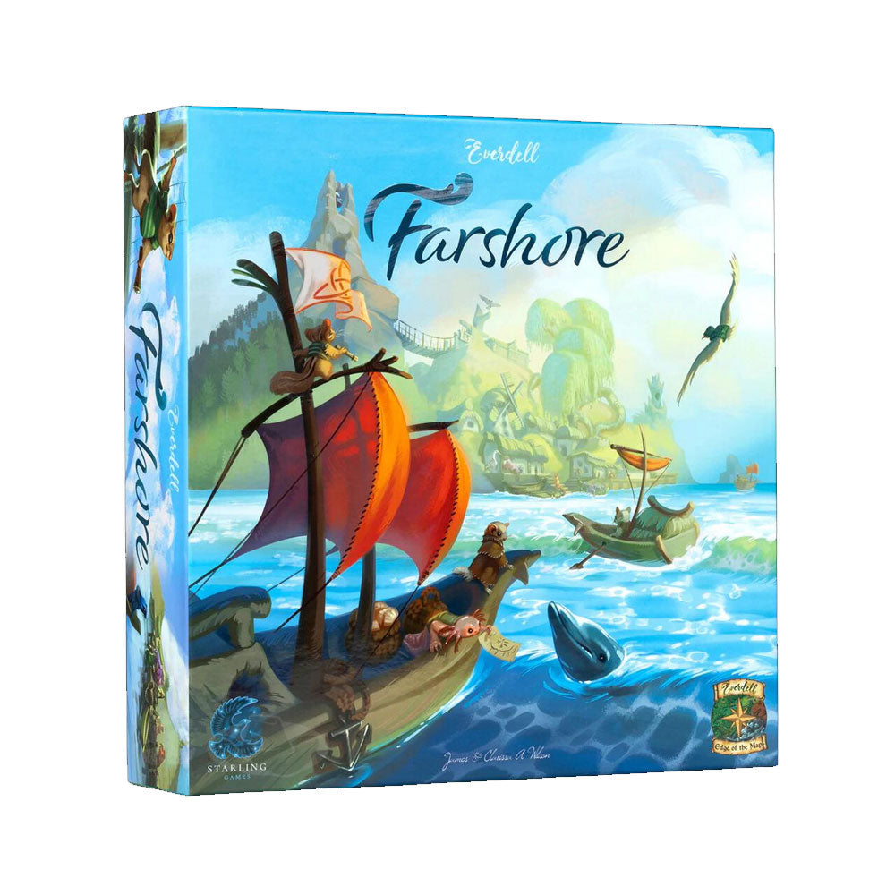 Welcome to Everdell Farshore, a standalone game set in the country of Farshore. Through each season, you lead a crew of critter workers to build up a prosperous city and to explore the enchanting ocean beyond. You must plan your actions carefully in order to build and to sail, for only by adapting to the winds of change will you succeed. The wind is high. The sun is breaking the horizon. It is time to set sail for adventure!