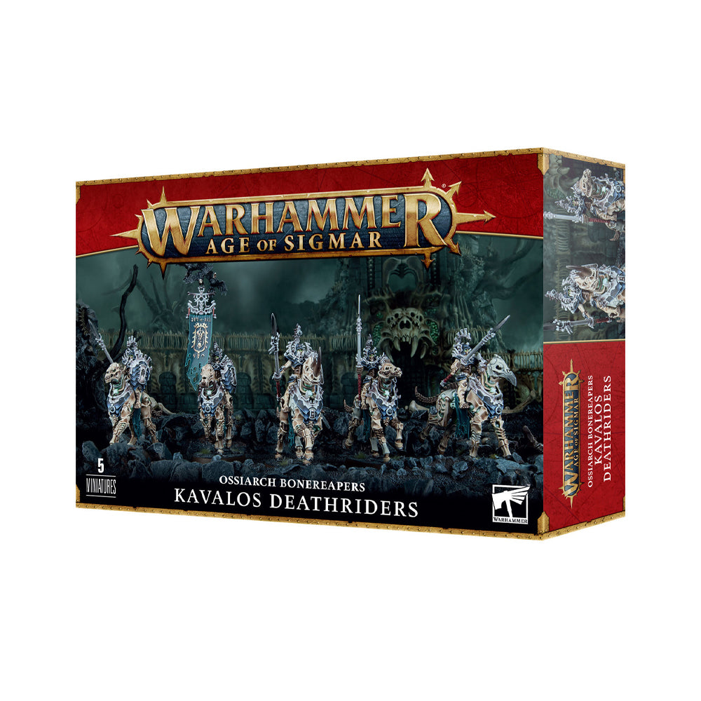 The heavy cavalry of the Ossiarch Bonereaper legions, the Kavalos Deathriders are expert riders mounted on macabre armoured steeds. They clatter into the foe in a wedge formation, breaking battlelines with every ferocious charge.