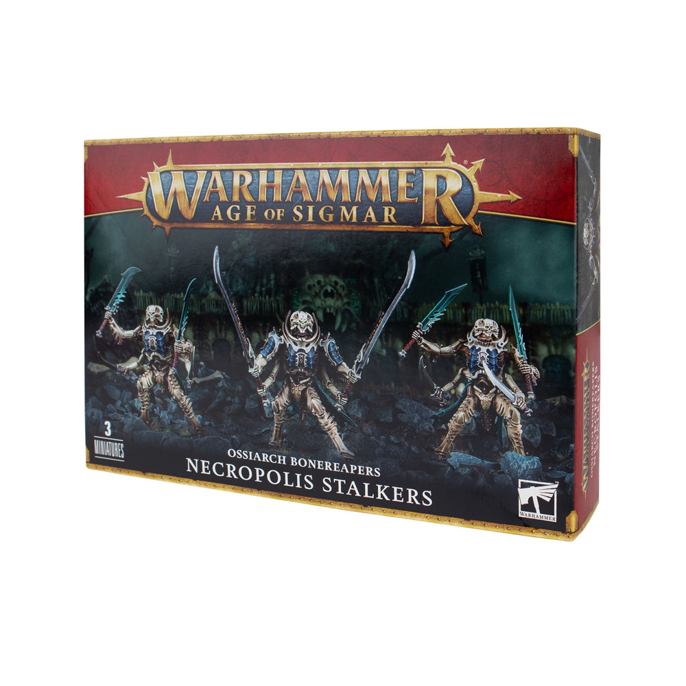 This multipart plastic kit makes 3 Necropolis Stalkers and comes supplied with 3x 50mm Citadel round bases. Alternately, the kit can be assembled as 3 Immortis Guard.