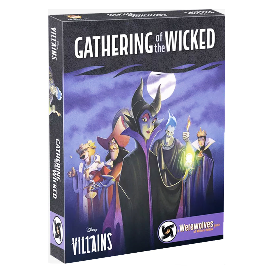 In Gathering of the Wicked, based on Werewolves of Miller's Hollow, you play as a Disney villain such as Maleficent, Hades, or Captain Hook who is gathering in a dark realm with various henchmen. There, two teams fight for control, alternating between day and night phases. Each night, the villains wake up one by one and use their unique abilities to chase their objectives. Each day, the gathering debates and tries to unmask the traitors amongst them, but since no one knows which team other players are on, trusting each other will be tricky, and bluffing will be their best route to dominance within their new surroundings.