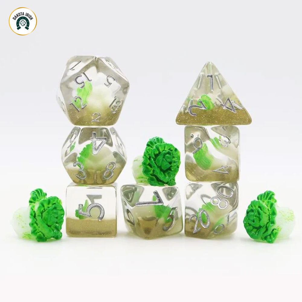 Clear dice with a light brown glitter layer and a cabbage inside. Or is it lettuce? The world may never know.