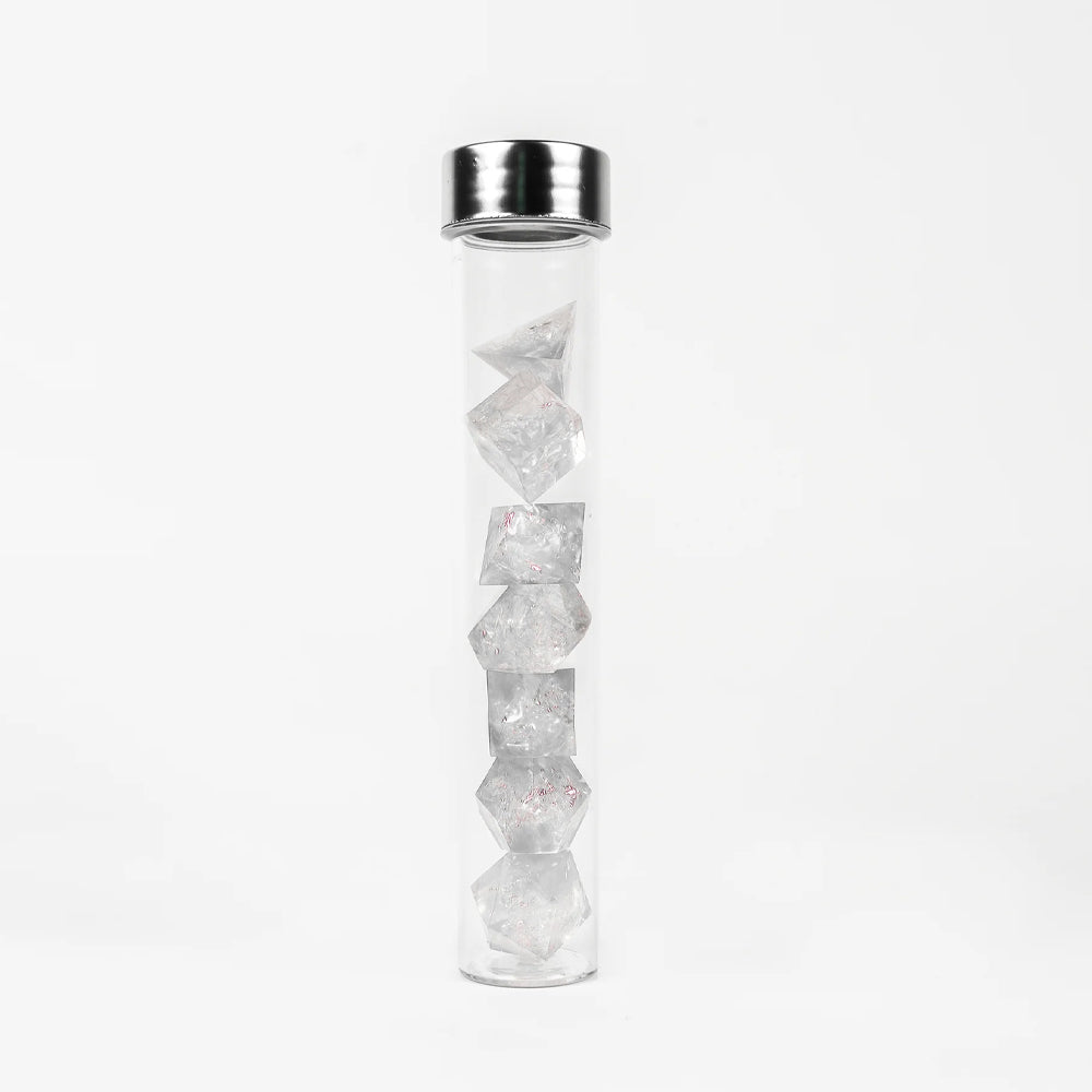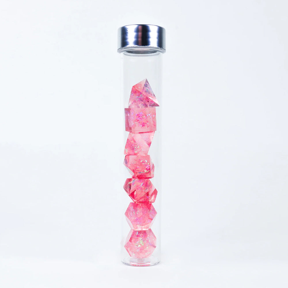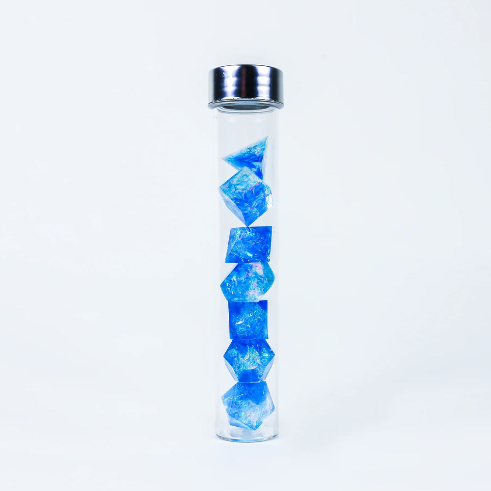 Add excitement and intrigue to your game with this ultra premium sharp edge dice set. Roll the die and reveal the result by using the accompanying UV light pen. These nice dice are hand polished sharp-edged translucent dice with an opalescent shimmer inside.