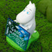 ● Moomin stands on the emerald grass, holding the blue transparent message board and peering out with curiosity.