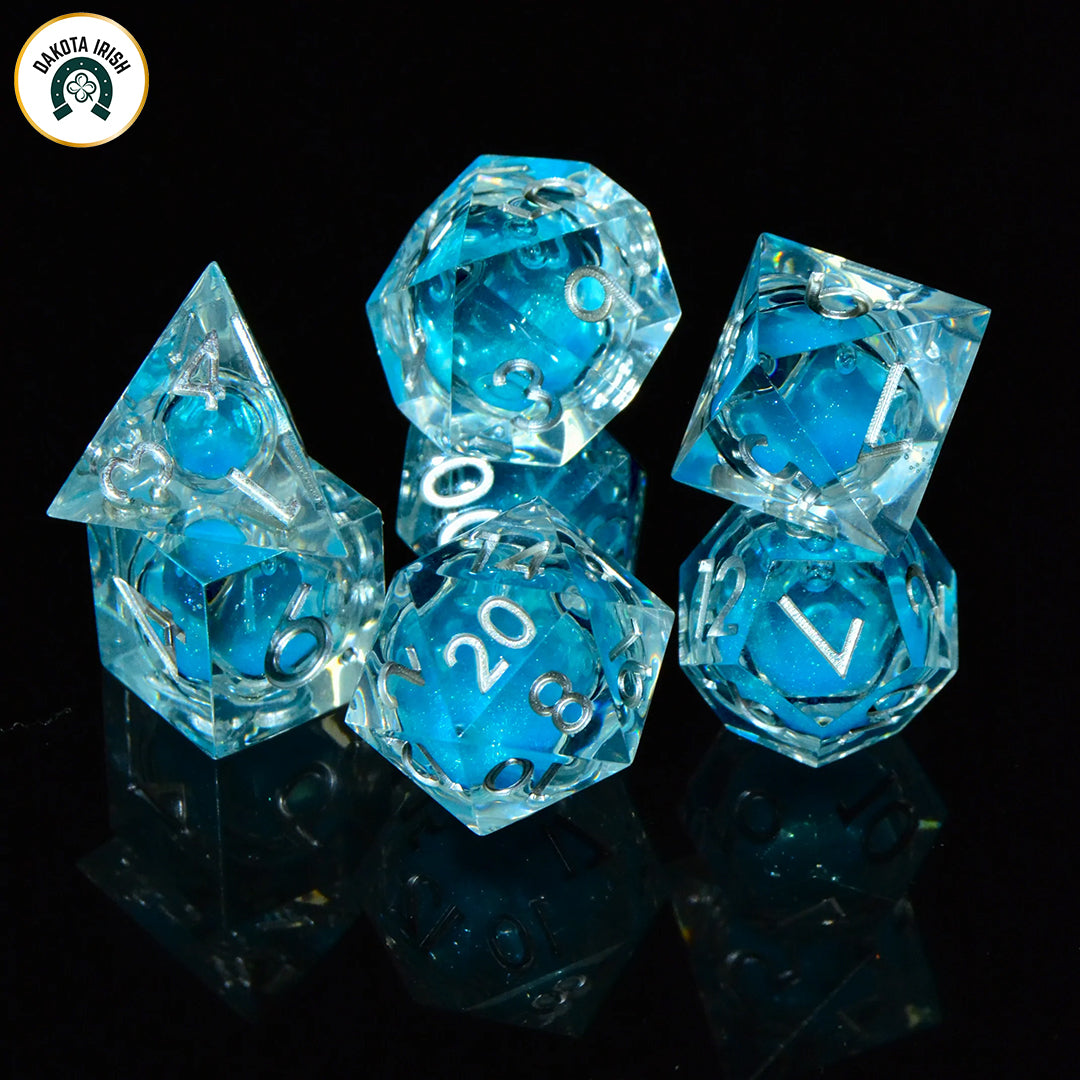 Beautiful sharp edge dice set featuring a sky blue liquid core inclusion that swirls and shimmers when rolled.