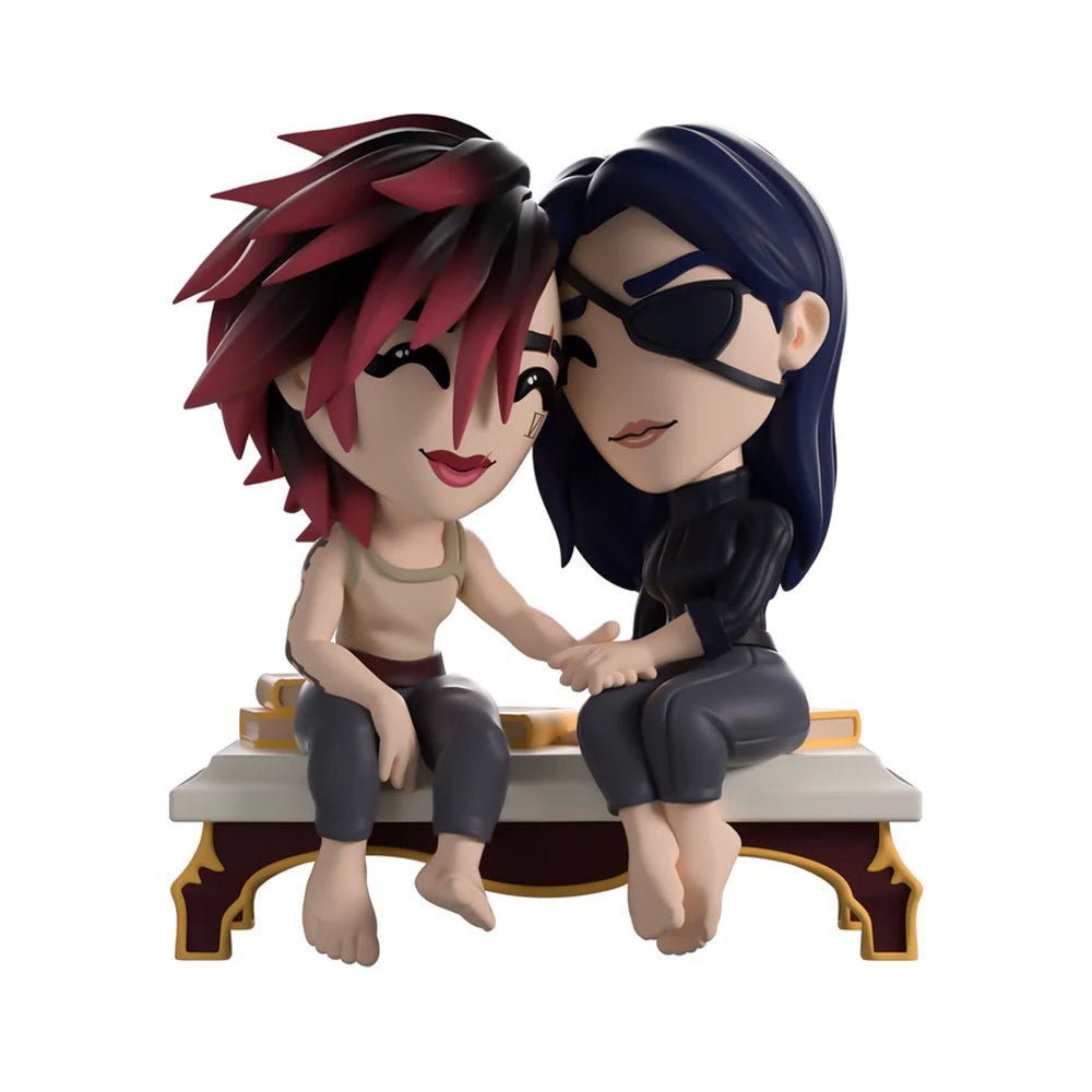 Vi and Caitlyn have taken a step away from the drama happening in Piltover to share a tender moment with their return to Youtooz. At 4.4 inches tall, this scene sees Vi and Caitlyn sitting on a white bench with books behind them as Vi extends her arm to hold onto Caitlyn’s hand and their heads press gently together. Both with relaxed smiles as they just enjoy each other’s company, Vi’s shaggy red black hair sweeps to the side as she wears a beige singlet and grey pants, while an eyepatch covers Caitlyn’s left eye and her long blue hair is tucked behind her ear as she wears a ribbed black turtleneck. The exterior of their dark blue packaging is covered in deep red and gold streaks running down it and a pink symbol at its center. These then work their way onto the smudged red and blue interior, while the protective sleeve is a dark blue with a simple golden frame as their figures can be seen through the large clear window at the packaging’s front. This collectible ships in a matte, embossed, protective outer sleeve and a custom-sized plastic protector for maximum protection during shipping.