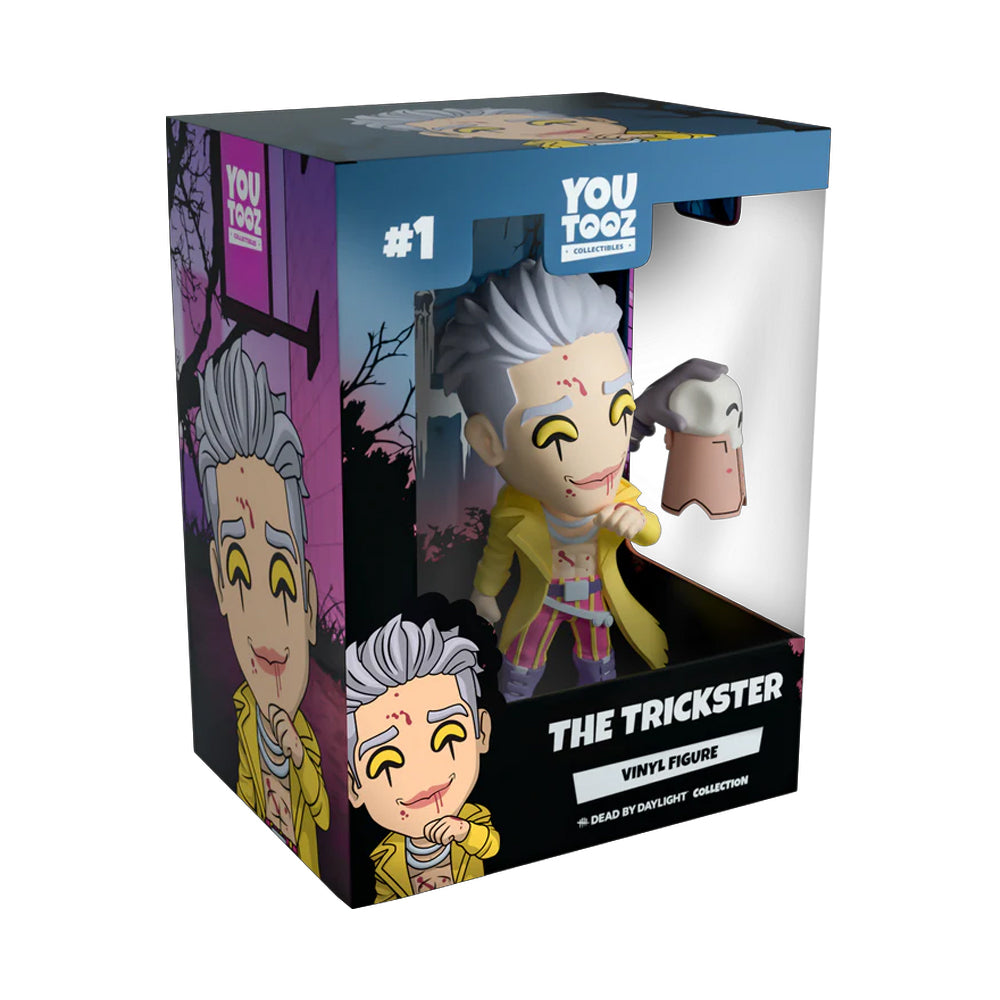 The Trickster is here to make his stylish (and terrifying!) debut! Standing at 4.7 inches with his undercut grey hair is shaved at the sides and is slicked up in thick points, glowing yellow eyes shine through dark makeup as he raises his hand to wipe the bright blood off his face. With a devilish smile that curls up at each end and holding a deadly bladed purple bat outwards in his right hand, he wears a long tattered yellow trench coat over a shirtless blood smeared chest while his tight red and yellow pants are tucked into tall purple boots. The exterior of his packaging sees Trickster in front of a purple backdrop of abandoned buildings. While the interior is a black silhouetted forest with a glowing red and blue haze and the white ‘Dead by Daylight’ logo at its back, This grim motif then continues onto the protective sleeve with dark trees surrounding it completely as the figure can be seen through the large clear window at its front. This collectible ships in a matte, embossed, protective outer sleeve and a custom sized plastic protector for maximum protection during shipping.