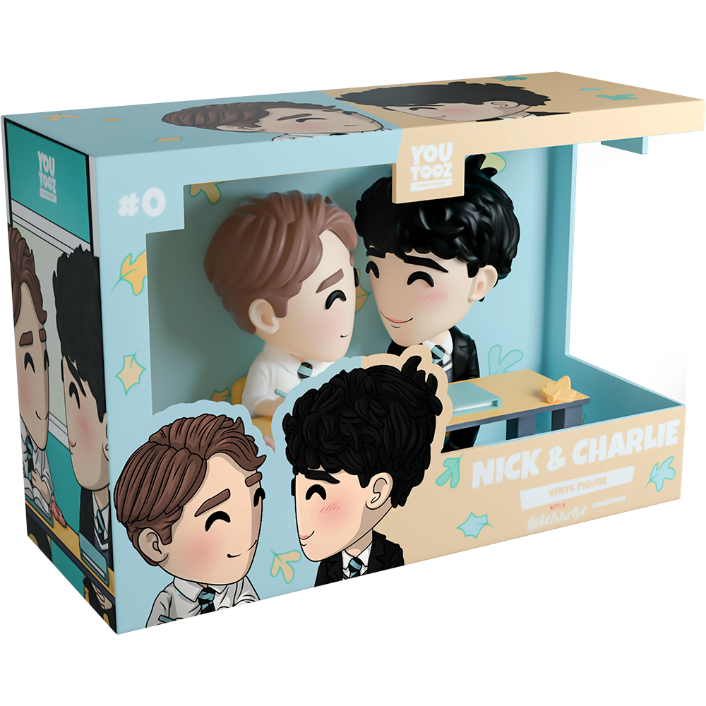 The worldwide fan-favorite show "Heartstopper" has arrived to Youtooz! This vinyl 2-pack comes with both Nick and Charlie during their first meet scene in class. Nick sits in the right seat, dressed in a white button up shirt and a teal and black tie with black pants. His light brown hair is parted to the left and he is posed looking over his left shoulder towards Charlie with a gentle smile and a noticeable blush on his face. Charlie is seated in the left seat, dressed with a black jacket on top of his white dress shirt and teal and black tie. He is posed with his hands clasped together on his lap and he is looking over his right shoulder at Nick. His black hair is styled in small curls and he wears a smile on his face with blush on his cheeks. The exterior of their double-walled packaging shows Nick and Charlie inside of the classroom sitting next to each other and the rugby field on the other side. The interior is a cute half light blue half orange split with a pattern of sleeves falling. This collectible ships in a matte, embossed, protective outer sleeve and a custom sized plastic protector for maximum protection during shipping.