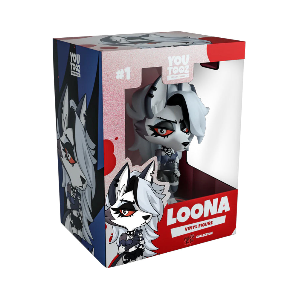 Loona lands at Youtooz to make her Youtooz debut, not that she wants to or anything… Standing at 5 inches tall with her knees pressed together and a bushy black and white tail flicking out, her long grey fringe sweeps over an unimpressed face as the rest of her hair falls down her back. With deep red eyes glancing to the side and gripping a phone in her right paw as the left rests on her hip, she wears a spiked collar and blue top with pentagram straps at its front along with black and white shorts. The exterior of their packaging sees a cool blue silhouette against a dark background, while the interior surrounds them entirely in maroon stripes that are reminiscent of dirty wallpaper. The protective sleeve is then patterned with diagonal black and white stripes and printed with the ‘Helluva Boss’ logo as their figure can be seen through the large clear display window at its front. This collectible was designed in collaboration with @therealracckun and ships in a matte, embossed, protective outer sleeve and a custom-sized plastic protector for maximum protection during shipping.