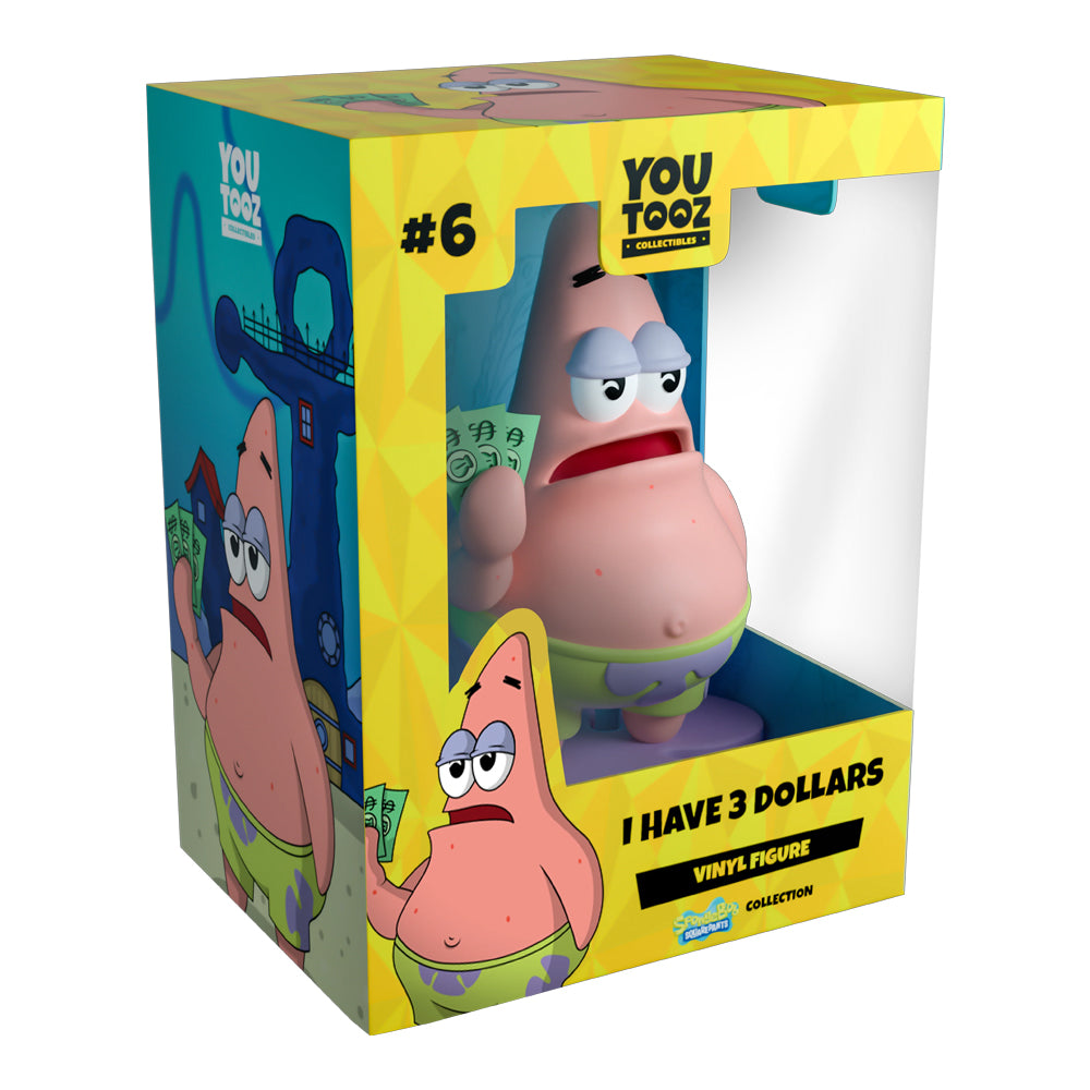 How much? That looks like the toilet plunger I threw out yesterday. I have 3 dollars. Standing at 4 inches tall, Patrick Star joins the Youtooz universe all the way from Bikini Bottom. Sculpted with a rounded bulging belly, slightly protruding belly button and wearing his usual shorts, Patrick holds 3 green dollar bills in his hand. This scene became an internet meme which let people express their lack of money in certain situations. His double-walled window box includes illustrations of marine scenery and a scene including Mr. Krabs. This collectible ships in a matte, embossed protective outer sleeve.