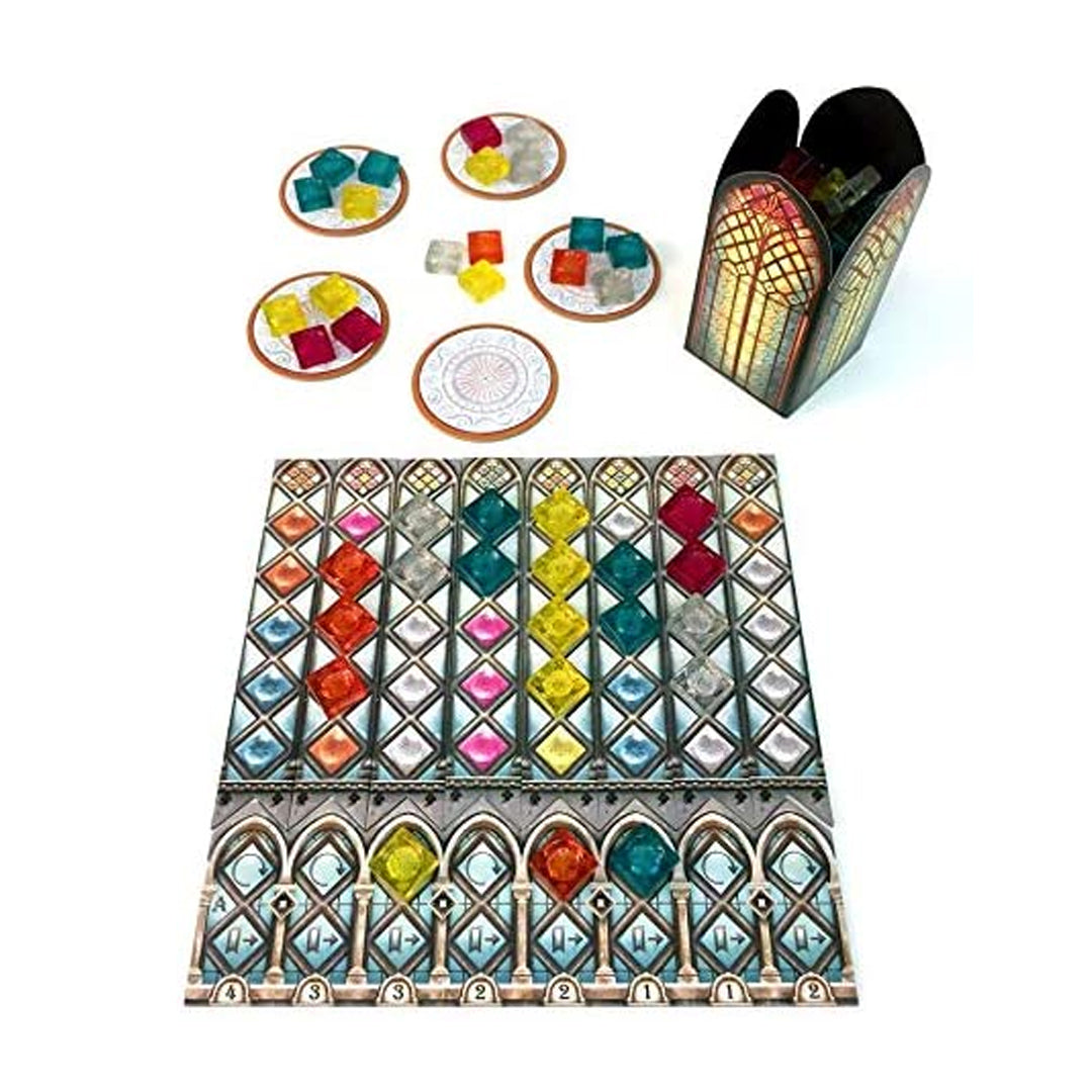 Each turn, a number of market tiles will be filled with four random transparent plastic tiles, drawn at random and in a possible five different colours. On a player’s turn they will select to take all the tiles of one colour from a market location and add them to one column in their player board, representing a stained glass window. Tiles must be placed on a spot of a matching colour and any extra tiles will be wasted, resulting in a deduction of points.