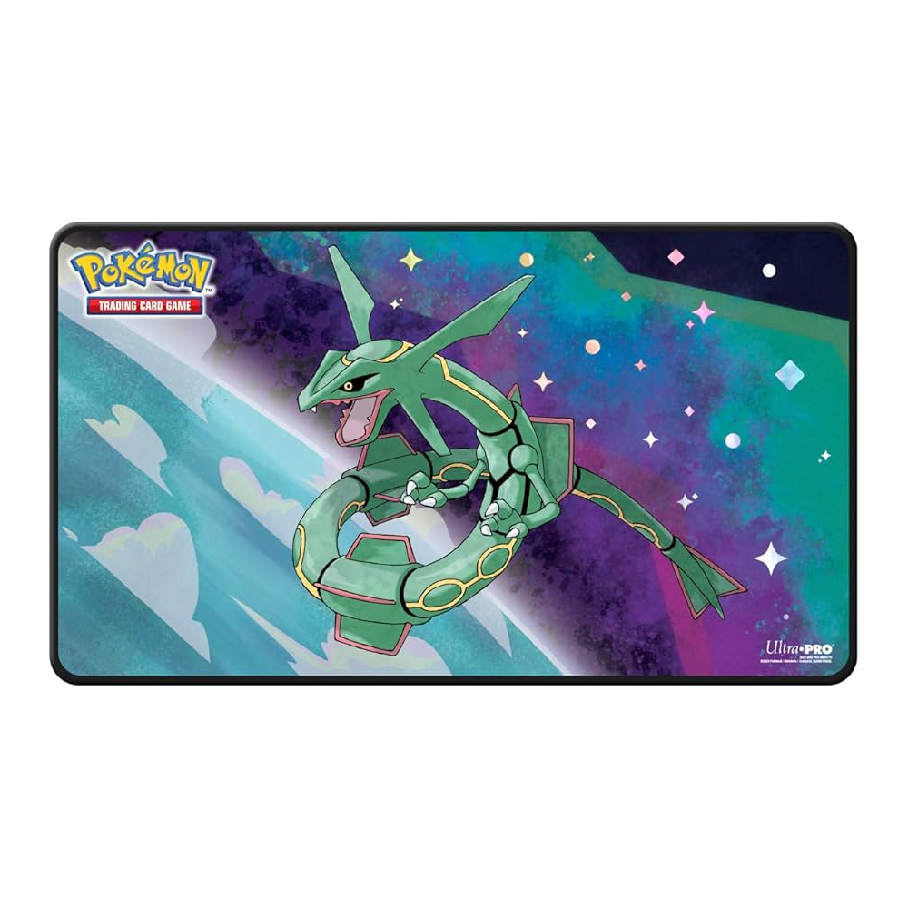 Make it a game to remember with Legendary Foil Playmats for Pokémon! With vibrant, full-color artwork of legendary Pokémon Rayquaza, this playmat features premium spot foil starlight accents for added shine. Made with a soft fabric top to reduce damage to cards during play and a non-slip rubber backing to keep the playmat from shifting during use, playmats enhance the gameplay experience. With dimensions of approximately 24 in. x 13.5 in., a playmat also makes an excellent oversize mousepad for home or office.