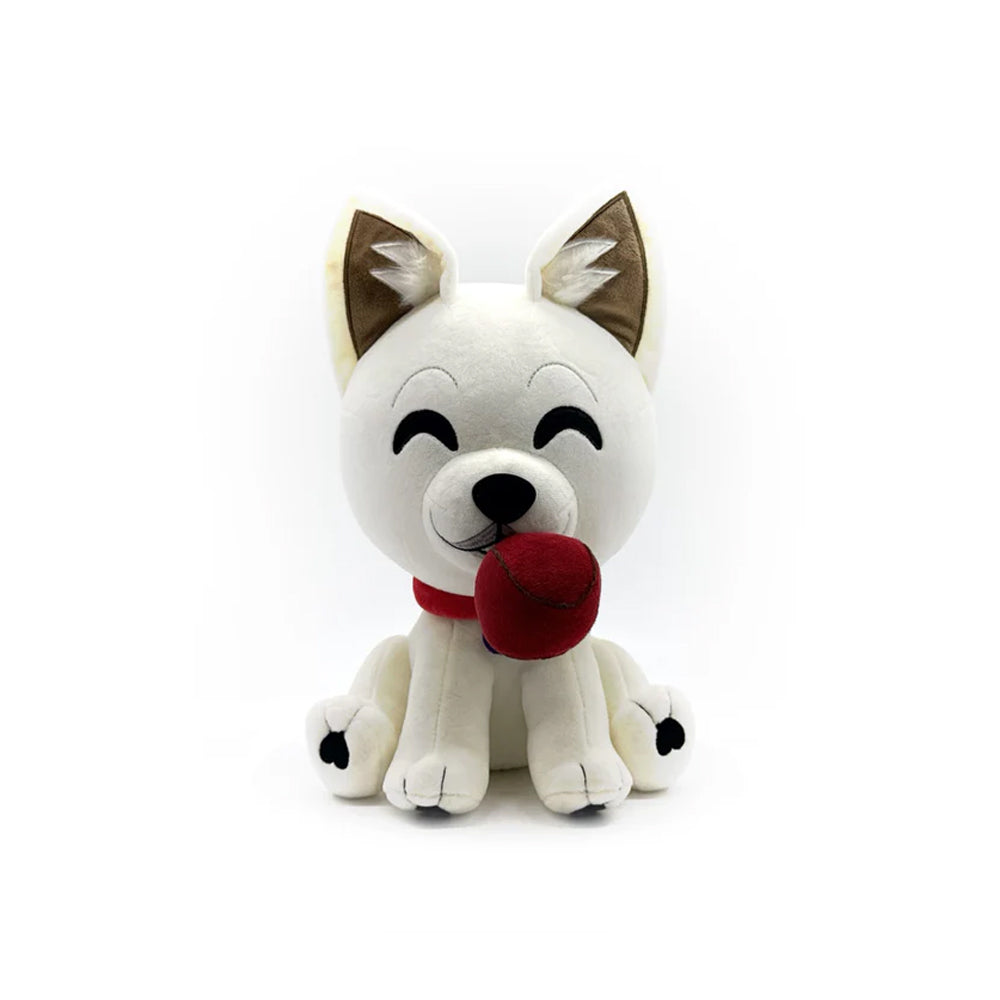 Did you pet the dog? WELL DID YOU?! Scratch sits at 9 inches tall with a pair of long pointed ears reaching out from the top of his head and a grey smile crossing his delighted face, just ready to play fetch with his favorite ball which can be held in place against his mouth with sewn in magnets! With a purple tag hanging from the bright red collar around his neck and his front paws propping him up, his back legs are kicked forward to show off heart shaped paw pads as a fluffy tail sticks out from behind. This plush is packed to the seams with 100% PP cotton and is made of a mix of long pile faux fur and minky materials, absolutely perfect for cuddling or playing fetch with!