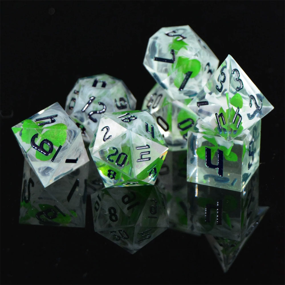 Stunning sharp-edged dice with a four-leaf clover, smoky like swirl set in clear resin.