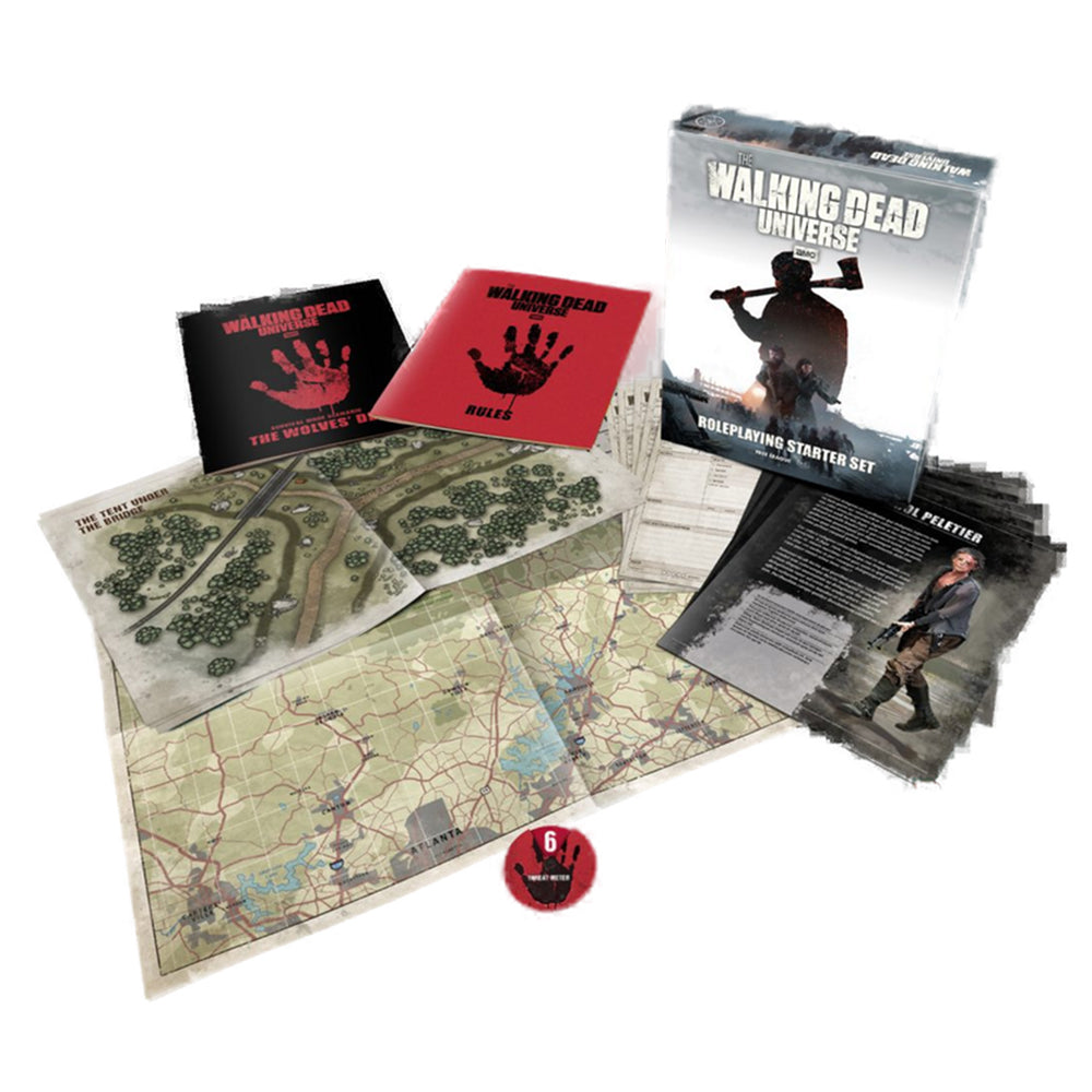 The boxed Starter Set for The Walking Dead Universe Roleplaying Game includes a condensed rulebook, pre-generated characters, and the first full-length survival scenario for you to play.