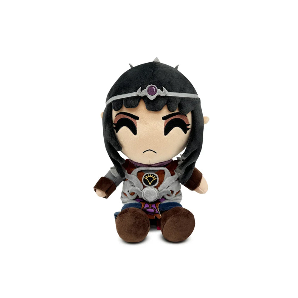 Shar has led Shadowheart back to Youtooz for her plush debut, and surely nothing else… right?! At 9 inches tall and sitting with her legs kicked forward, a stern frown flashes across her face which is framed by bangs and a blunt fringe of black hair which is held in place with a silver circlet and hairpiece as a long ponytail falls down her back. Wearing ornate silver armor that wraps over her brown chest piece and adorns each shoulder, her grey dress is hemmed in a dark blue as a purple waist cloth rests between her legs. This plush is packed to the seams with 100% PP cotton and is made of minky and felt materials, absolutely perfect for cuddling or serving Shar with!