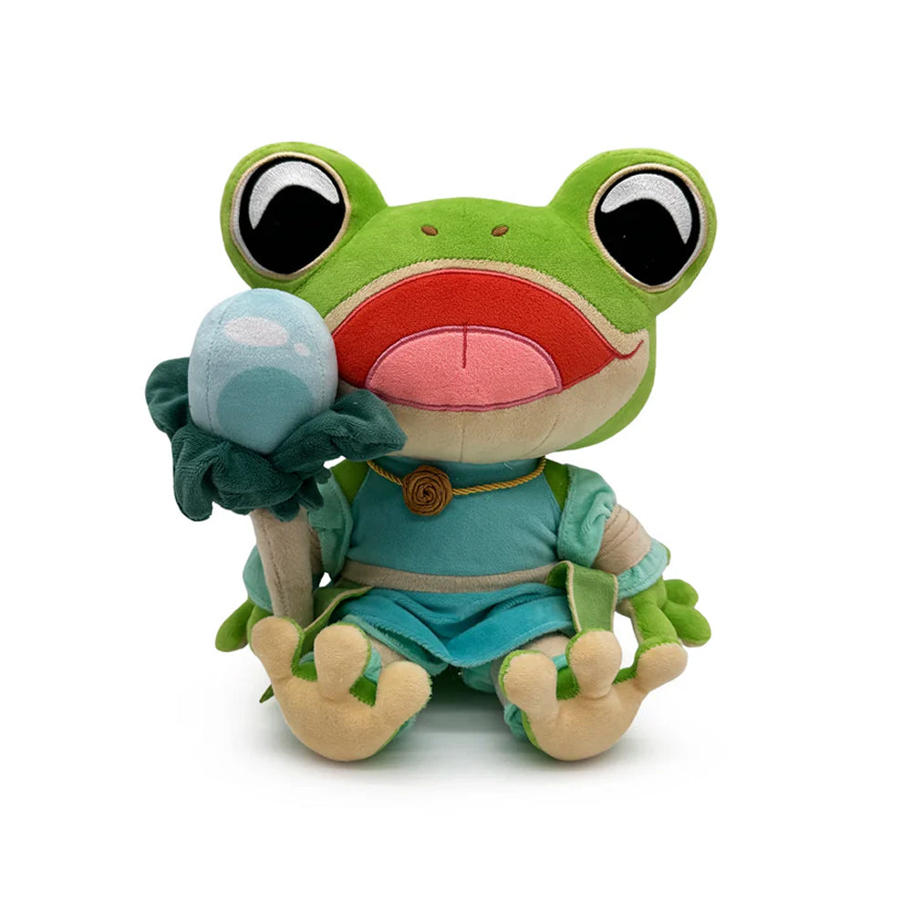 Helga’s had a vision! What is it you may ask? It's her Youtooz debut of course! Sitting at 9 inches tall with a huge open smile stretching across her green face under a pair of gleaming round eyes, in her right hand she holds a staff topped with a blue orb that protrudes from deep green leaves. Wearing a rose pendant around her neck and dressed in a light blue dress that has green panels attached around the waist and crudely tied armbands, her three-toed web feet stick forward to show off light undersides. This plush is packed to the seams with 100% PP cotton and is made of minky, nylon and metal materials, absolutely perfect for cuddling or drawing your visions with!