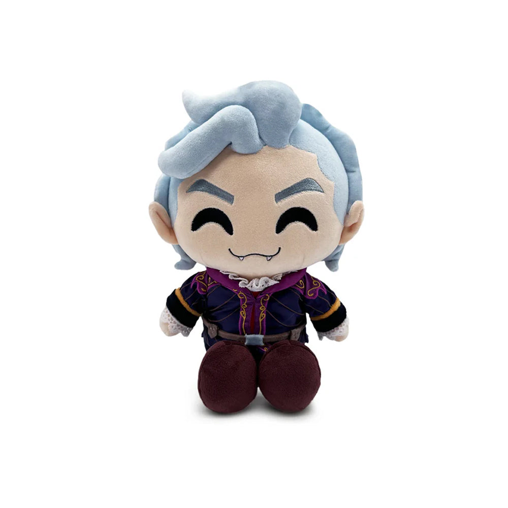 Astarion’s back from the dead!... No wait, he’s back at Youtooz! For a dashing plush debut! Sitting at 9 inches tall with a pair of vampiric teeth poking out from a curling smile as his elegant white hair is coiffed to the side at the fringe and pointed ears stick out from the sides, he’s dressed in an elegant blue and gold tunic with maroon trimming across the chest. With white puffy sleeves emerging at his wrist and a brown belt around his waist, he wears blue pants and brown boots. This plush is packed to the seams with 100% PP cotton and is made of the softest minky material, absolutely perfect for cuddling or seeking freedom with!