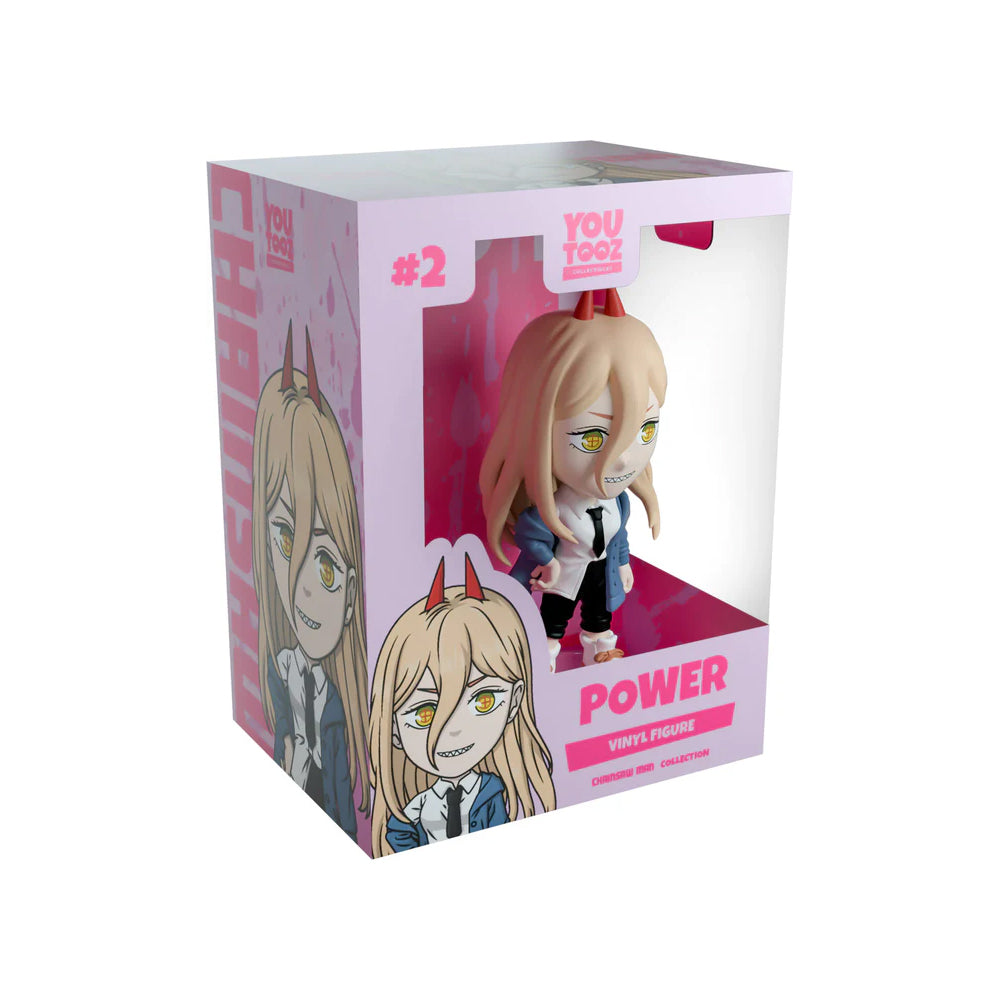 Power has turned Youtooz into her eternal slave with her debut! That’s how it works? Right?! With long locks of messy blonde hair falling down in waves, a single thick strand rests across her face that shines with a sharp toothed grin while her red and yellow eyes gleam with excitement! Standing at 4.7 inches tall from pointed red horns to chunky two tone sneakers, she’s posed with a hand resting on her hip and wears a blue overcoat that hangs off one shoulder that sits over her untucked white shirt and tie along with rolled up black pants. The exterior of her packaging is a light green stamped with kanji and splattered in a vibrant red spray which also covers the bright pink interior. The protective sleeve shows a playful Power standing in front of the red splatter that bleeds onto the green background as her figure can be seen through the large clear window at packaging’s front. This collectible ships in a matte, embossed, protective outer sleeve and a custom sized plastic protector for maximum protection during shipping.