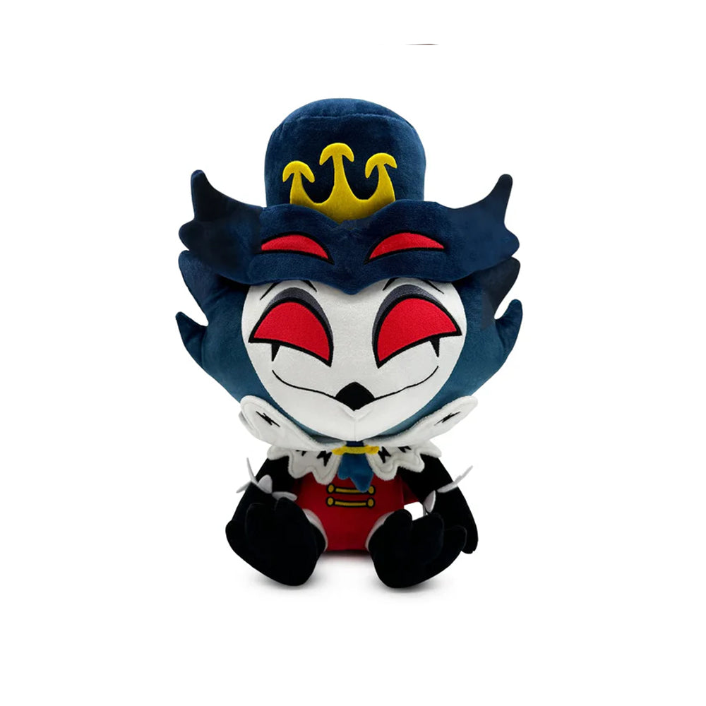 Now I wonder what royal decree has brought Stolas back to Youtooz? It’s got to be his plush debut right?! Sitting at 9 inches tall with a thin smile curling up over his white avian face to sit under two pairs of bright red eyes, the dark plumage of his head parts in the middle to frame his golden crown with the hair sweeping to either side of his top hat. Dressed elegantly as a true prince always should, the white and black collar of his long coat fans out around his neck and drapes down his back over a red tunic that’s adorned with golden buttons on its front as his clawed feet are kicked forward. This plush is packed to the seams with 100% PP cotton and is made of soft minky and felt materials, absolutely perfect for cuddling or ruling with!